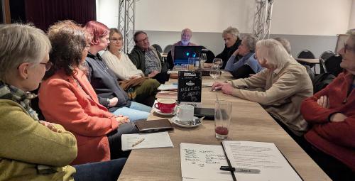 Kürzlich fand mit insgesamt acht Interessierten der erste Termin im neuen Jahr statt. Ellen Balsewitsch-Oldach hatte sich dafür ein Schreibspiel einfallen lassen: Alle Teilnehmenden sollten sich einen Gegenstand oder eine Person im Raum aussuchen und mit den passendsten Worten so beschreiben, dass die anderen Anwesenden beim Vorlesen des fertigen Textes erraten konnten, um wen oder was es sich handelte – natürlich freiwillig.
